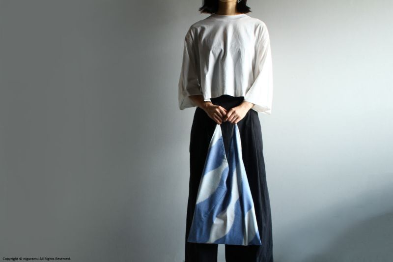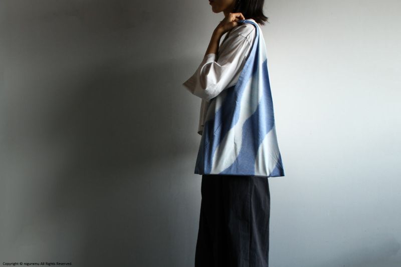 サイズ 390"W × 640"H mm 重量: 60g 材質 綿100% 久留米絣(くるめがすり)の反物幅を生かした”あずま袋”にひと手間加えたトートバッグ。